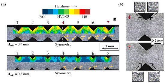 Cross-section analysis of stamped wire strip. (a) Micrographs and hardness measurements for dmin = 0.3 mm and 0.5 mm. (b) Micrographs of middle and outer notch for dmin = 0.3 mm.