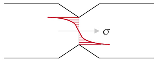 The separation behavior of wire strips during cyclic bending is greatly affected by the presence of notches, which represent discontinuities and lead to stress peaks in the notch roots during loading (Figure 16). Despite the usually undesired limiting of strength or lifetime [16], the notch effect is intentionally used in this case. The stress peak’s magnitude and its effects on the work piece’s strength depend on the notch geometry and loading conditions. For analyzing the impacts, the mentioned influencing factors were varied by different settings of d (modified notch geometry) and β (modified loading condition) in the above-described interaction study.