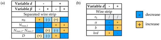 Matrices of influence. (a) Effect of the rolling gap d and the bending angle β on the material separation during cyclic bending of rolled wire strip. (b) Partial effect of d on rolled wire strip.