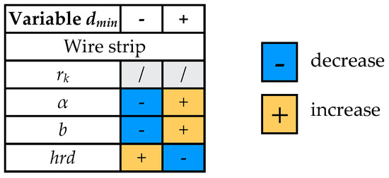 For deriving a method of process analysis based on stamped wire strips, the difference in the derived characteristics of the above-described notching experiments have to be discussed. Concluding the notch stamping results, Figure 18 color-codes the identified effects and Table 3 lists the geometry and hardening measurements for both considered settings of dmin. The averaged hardness value was determined for the middle notch (4) and represents the hardening level of the wire strip. The hardness of neighboring notches differs by max. 20 HV. The notch tip radius rk did not show any relevant changes. Higher dmin leads to greater notch angle α and greater web height b. The hardness decreases for higher dmin.