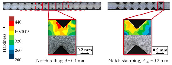 The analysis of the hardening distribution of rolled wire strips showed an uneven hardening of the notch flanks due to the rolling kinematic. The flanks’ hardening of stamped wire strip strongly depends on the notch’s position in the middle or outer area. As discussed above and shown in Figure 19, this feature can be purposefully utilized to find a hardness distribution similar to that of rolled wire strip. From the above results, it is suggested to test the outer notch (7) during cyclic bending. When applying the proposed tool’s notch angle, an analysis of a possible effect of the angle change on the strain hardening should be performed first.