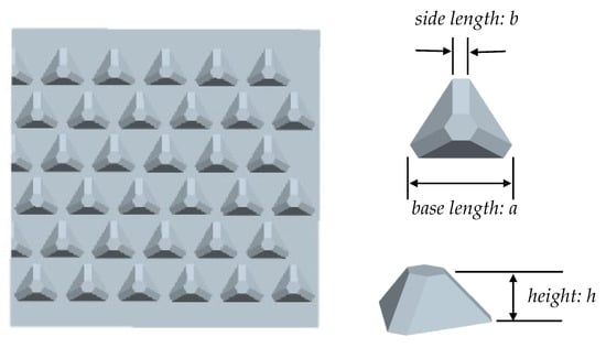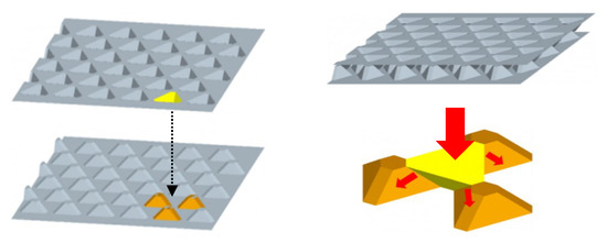 The truss core panel shown in Figure 1 is constructed by the orderly arrangement of the truss core parts on a flat plate. A truss core has a hexagonal truncated pyramidal shape with three trapezoidal sides and three rectangular sides and is represented by these shape parameters: height h, base length a, and side length b [29]. A double truss core panel is constructed by connecting two truss core panels with opposite sides facing each other, as shown in Figure 2. When a load is applied from the out-of-plane direction, the load tends to spread to the truss core panel through the slanted contact surfaces of the truss cores. The truss core panel has good initial bending stiffness and vibration characteristics.