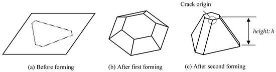 To solve this problem, a two-step deep drawing method using a progressive die was proposed [29]. In the first step, the flat plate material shown in Figure 3a was formed into the shape of the intermediate model shown in Figure 3b. In the second step, the final truss core panel was molded from the shape of the intermediate model. Thus, the truss core panel with a relatively high height h was formed using a two-stage deep drawing process, as shown in Figure 3c.