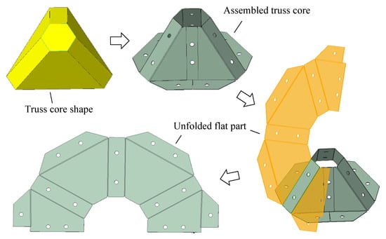 The process of constructing the planar parts of the assembled truss core is shown in Figure 4. Firstly, an assembled truss core was created from the truss core geometry. The planar part was then constructed by opening the assembled truss core geometry.