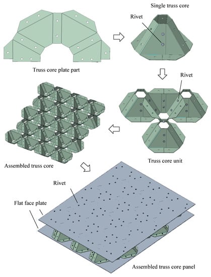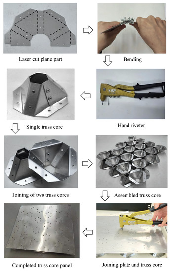 Assembled truss core panels were formed as shown in Figure 5. Firstly, the planar part of the truss core was bent. The joints were glued and riveted to obtain a single truss core. Subsequently, the four single truss cores were alternately combined. A truss core unit was obtained by attaching the oblique joints between the truss cores with glue and rivets. Thereafter, several truss core units were joined with glue and rivets to obtain a component of the assembled truss core. The final assembled truss core panel was thus obtained by gluing and riveting face plates to both sides of the assembled truss core members.