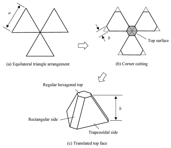The truss core shape can be designed according to the 3 steps shown in Figure 6. In step 1, the plane was divided into equilateral triangles of side length a, as shown in Figure 6a. In step 2, each of the three corners was cut with width b to obtain equilateral triangular and hexagonal shapes, as shown in Figure 6b. In step 3, the equilateral triangle was translated vertically to a height h to obtain a three-dimensional truss core shape. The truss core consists of a regular hexagonal top face, three rectangular sides, and three trapezoidal sides. The geometric parameters of the truss core are a, b, and h.