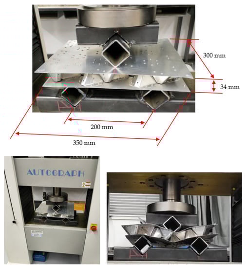 A three-point bending test was used to study the mechanical properties of the assembled truss core panel, as shown in Figure 11. The autograph machine used was a Shimadzu AG-300kNG. The side length of the assembled truss core panel was 350 mm × 300 mm and its thickness was 34 mm. The support width for the three-point bending test was 200 mm. A square steel pipe with a side length of 50 mm was used for the three-point bending jig, which was in contact with the assembled truss core panel. The corners were rounded to 10 mm.