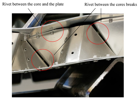 Comparing the two graphs in Figure 14, it is evident that the rivets first fell off at a displacement of approximately 6 mm. This is related to the fact that both truss core panels have the same internal geometry. However, as the adhesive has a bonding action, when both the adhesive and rivets are used for bonding, the number of occurrences of the rivets falling off is relatively low, as is the amount of load drop.