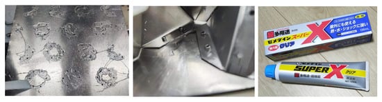 To test this strategy, two different truss core panels were prepared under the same conditions, with one truss core panel joined solely with rivets and the other truss core panel joined using both glue and rivets, as shown in Figure 13. The glue used here is the AX-041 chemically reactive glue manufactured by the CEMEDINE company.