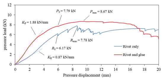 The load when the joining rivet first came off was P0 = 7.79 kN when glue and rivets were used, whereas it was R0 = 6.17 kN when only rivets were used. Thus, bonding with glue and rivets allows a 26.3% higher load than bonding with rivets alone.