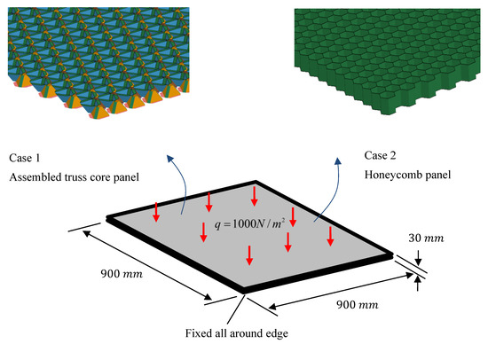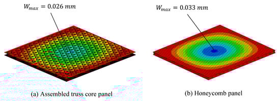 The maximum deflection of the assembled truss core panel was 0.026 mm and that of the honeycomb panel was 0.033 mm. The maximum deflection of the assembled truss core panels was 21.2% less than that of the honeycomb panels.
