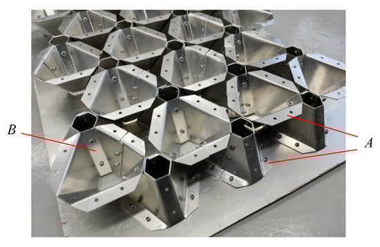 Figure 10 shows the state of the processing experiment on the assembled truss core panel. The plane parts were cut with a laser processing machine according to the CAD shape data. A bending tool was used to bend the planar part into the shape of a truss core along the fold lines, and the folded parts were attached with glue and rivets to obtain a single truss core. Adjacent truss cores were affixed with glue and rivets along the rectangular sides of the truss cores to obtain a double truss core set. Similarly, several adjacent truss cores were riveted together and secured with an adhesive to form an assembled truss core member. Finally, flat plates were glued and riveted to each side of the assembled truss core member to obtain the final assembled truss core panel.