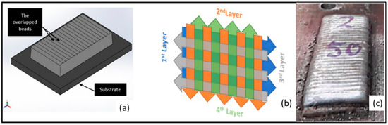 Schematics representing (a) prismatic block; (b) beads’ building tool path strategy; and (c) picture of the as-WAAM-ed blocks.