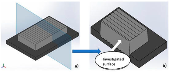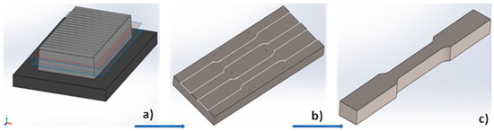 Reported values by Xie et al. for ultimate tensile strength (UTS) and yield strength (YS) of the 316L stainless steel were higher for vertical specimens as opposed to horizontal specimens, due to the anisotropy inherent in the WAAM process [16]. This variation could also be influenced by grain orientation, heat input, directionality of heat flow, layer stacking, and thermal gradient attained during the deposition process of WAAM-ed parts [17,18]. Therefore, tensile samples were cut along the length of the prismatic steel blocks. The tensile specimens were cut along the central zone of the block to guarantee the inclusion of both longitudinal and transverse successive deposited layers, as shown in Figure 5.