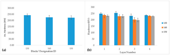 Bar charts displaying the hardness values. (a) Average values and (b) layer-by-layer values for the 130, 140, and 150 built blocks.
