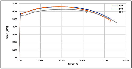 Stress–strain diagram comparing the average behavior of the tensile testing of 130, 140, and 150.
