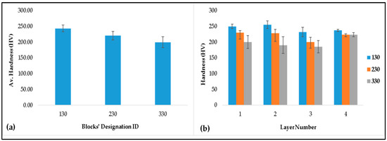 Bar charts displaying the hardness values. (a) Average values and (b) layer-by-layer values for the 130, 230, and 330 built blocks.