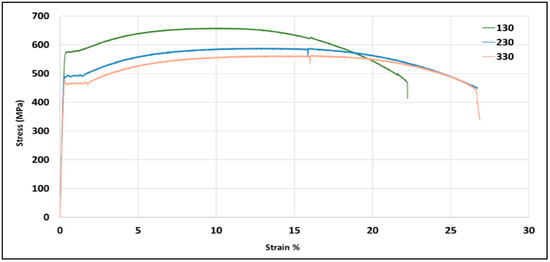 Figure 7 displays the tensile behavior of the blocks built at a constant BW of 5 mm and increasing OP between the adjacent beads (30, 40, and 50%). It is clear that the yield and ultimate tensile strength are highest for the 130 and 140 compared to the 150 built blocks. The UTS for the 130 and 140 blocks exhibited almost the same value of 660 MPa at about 22% elongation, while that of 150 was 628 MPa at 23% elongation. The higher the OP, the higher the heating cycles associated with the increased number of deposited beads per layer. This results in an overall softening effect, which reduces strength and increases ductility (150 condition) [17,20].