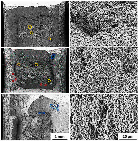 Figure 10 shows SEM images for the fracture surfaces of the tensile samples for 130 (Figure 10a,b), 230 (Figure 10c,d), and 330 (Figure 10e,f) at low and high magnifications. Low-magnification images (Figure 10a,c,e) revealed lower ductility for 130 (Figure 10a) compared to 230 (Figure 10c) and 330 (Figure 10e), which was evident by the smaller central cups associated with large shear lips. Higher-magnification images revealed typical ductile failure features manifested by the formed dimples. Blocks built using the smallest BW of 5 mm (130 condition) showed the finest dimple sizes compared to the wider beads 230 and 330, as shown in Figure 10d,f. The larger the BW, the coarser the dimples, which agrees with the tensile behavior displayed in Figure 10. The fracture surfaces also revealed fine spherical porosities (red circles), microvoids (yellow circles), and secondary cracking (blue ovals), similar to the findings of [22]. No evidence for tear ridges was observed in the fracture surfaces of the three conditions. According to Tripathi et al. [23], who tested ER70S-6 low-carbon steel samples cut horizontally similar to this study, tear ridges were only observed for the samples that were sliced horizontally (perpendicular to the building direction) in a single-bead wall. Tensile samples cut parallel to the building direction showed no evidence for tear ridges. They explained this behavior by the facilitated fast cleavage fracture by crack propagation mechanism parallel to interlayer interfaces. It is suggested that the orthogonal alternate deposition strategy employed for the building of the blocks provided a uniform distribution of the stress along the gage length, which prevented the formation of the tear ridges during fracture [23].