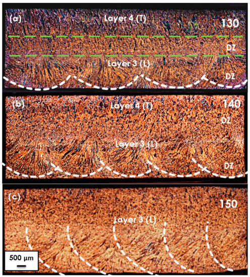 It is also clear that the higher the heat input, associated with the wider bead (330), the deeper the penetration in the substrate and the larger the diffusion zone (DZ) between any two deposited layers (Figure 12b). Moreover, the identification of the transition zones between the successive layers was very difficult for 330. This can be attributed to the higher heat input, which results in deeper and wider penetration of the deposited layer smearing out the DZ [25]. Furthermore, the 330 microstructure (Figure 12b) manifested the influence of higher heat input more than 130 (Figure 12a), as observed in HAZ formed in the substrate below the DZ of the first layer.