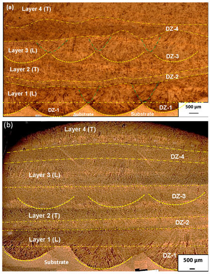 OM panoramic images for the WAAM-ed prismatic blocks built at (a) 130 (5 mm); (b) 330 (9 mm) at a constant OP (30%). Diffusion zone—DZ, longitudinal layer—L, transverse layer—T; green dashed lines represent turbulent zones.