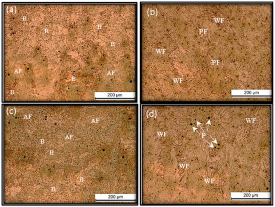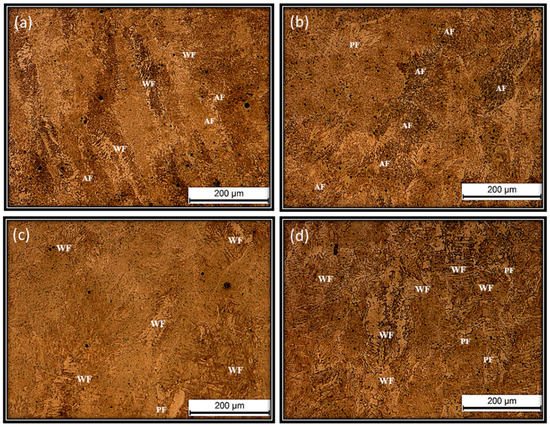 Investigation of the formed phases along the building direction revealed the formation of Widmanstatten ferrite (WF), acicular ferrite (AF), polygonal ferrite (PF), pearlite, and bainite phases (Figure 13 and Figure 14). Cooling rates and heating cycles have a strong influence on the type, size, and distribution of the phases formed along the building direction. For 130 (Figure 14a), AF and WF can be observed within the columnar grains of DZ-1 of the first layer with the substrate, while a combination of bainite and AF was formed in the successive layers, including the second and third layers (Figure 13a,c).