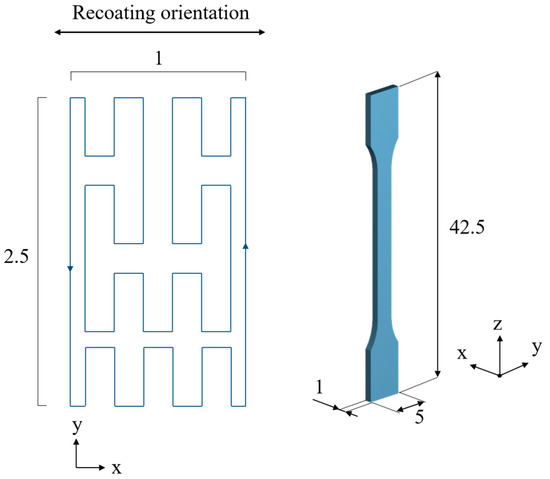 Further processing parameters include a build temperature of TB = 25 °C, a recoating speed of v = 125 mm s−1 and a layer height of hLayer = 100 μm. Manufactured specimens compromise scaled, thin-walled tensile bars designed according to ISO 3167, type 1A. For resembling thin-walled geometries, an isotropic scale factor of 0.25 was applied to the standardized geometry, corresponding to a constant wall thickness of 1.0 mm. Given the upward build orientation, a minimum rectangular cross section of 2.5 mm2 was obtained, corresponding to the exposure of a single sub-segment. A number of n = 5 specimens, corresponding to a specific parameter set, were manufactured.