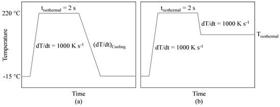 Fast scanning calorimetry (FSC) was used for the process-related characterization of temperature-dependent crystallization kinetics, considering noticeably increased cooling rates in non-isothermal processing of polymers. The underlying experimental studies, which make use of a chip calorimeter of the type Flash DSC 2+ (Mettler-Toledo GmbH, Giessen, Germany), comprised both non-isothermal and isothermal characterizations for obtaining comparative crystallization kinetics under varying cooling kinetics. Applied temperature–time profiles are schematically displayed in Figure 2, illustrating the application of constant cooling rates suitable for non-isothermal fast scanning calorimetry.