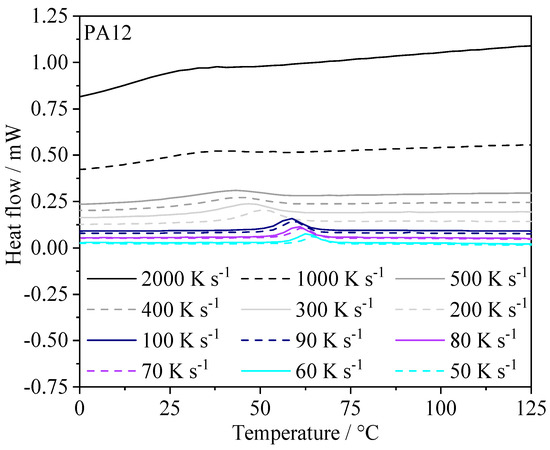 Process-oriented measurements, based on fast scanning calorimetry of PA12, show a significant supercooling at high cooling rates. In addition to the clear inverse relationship between the crystallization peak temperature and the underlying cooling rate, a growing suppression of crystallization processes is observed, evident in Figure 3. These findings are consistent with those made by Zhang et al. (2022) [27], who concluded that the crystallization of polyamide 12 was predominantly suppressed at cooling rates exceeding 300 K s−1.