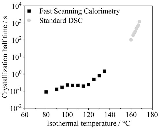 Consistent with earlier research on isothermal crystallization kinetics of polyamide 12 described by Paolucci et al. (2018) [22], the determined crystallization half times, shown in Figure 4, depict a bimodal distribution of crystallization half times, exhibiting a local maximum at 100 °C.