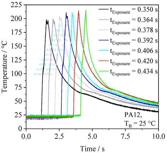 Based on the application of quasi-simultaneous, fractal laser exposure, the exposure process depicts a step-wise temperature increase of distinct segments, displayed in Figure 5. Observed peak temperatures depict a positive correlation with the underlying exposure time, exhibiting a near-linear influence of the exposure time and resulting peak temperatures.