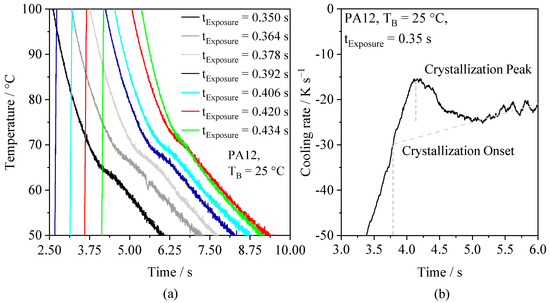 In contrast to quasi-isothermal LPBF, non-isothermal LPBF is characterized by the vastly accelerated cooling and the corresponding accelerated crystallization of formed polymer melts. A significant temporal contraction of the cooling process is associated with the emergence of supercooling, consistent with prior fast scanning calorimetric measurements, and semi-empirical models derived from empirical fittings of the Hoffman–Lauritzen theory [24,26], indicating both a reduced crystallization temperature [22] and reduced crystallization half times [22,24]. Given a considerably accelerated crystallization process, high-speed thermal imaging of the cooling process enables the in situ characterization of the exothermal material crystallization based on noticeably increased crystallization kinetics emerging at process-related conditions. Subsequent to the parameter-dependent, rapid cooling of the molten polymer, a parameter-dependent temporary decrease of the thermographically detected cooling rate is observed. A similar phenomenon is evident in quasi-isothermal LPBF of polymers, depicting a slowed cooling induced by material crystallization, determined based on numerical simulations [29]. Figure 6a illustrates the relationship between the calculated non-monotonic variations of the cooling rate and the parameter-dependent exothermal crystallization. Observed time–temperature profiles indicate a positive dependence of the thermographically observed crystallization peak temperature on the underlying quasi-simultaneous exposure time. Figure 6b shows the corresponding definition of the thermographically represented crystallization peak and onset, enabling the reproducible definition of temporal references.