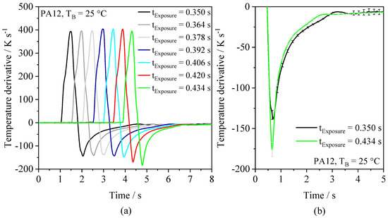 By considering the temporal variation of the thermographically observable, process-specific temperature derivative, structural process-induced influences on the temporal development of emerging cooling rates are derived. Based on these observations, the peak cooling rate depicts a statistically significant positive correlation (n = 5) with the applied effective exposure time, displayed in Figure 7.
