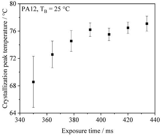 The aforementioned positive correlation of the exposure time and the emerging crystallization peak temperature, displayed in Figure 6, can be correlated with the time-dependent occurrence of process-specific cooling rates. An increased exposure time is correlated with an increased peak cooling rate, followed by a rapid decay of observed cooling rates and a subsequent steady decline of observed cooling rates. The apparent dual-phase process, observed when applying elevated energy density levels, leads to the initial rapid supercooling of the polymer melt. Initiated by the subsequent phase of relatively slow cooling, the crystallization process is observed to occur at an elevated temperature level in accordance with corresponding differential calorimetry measurements. The initial occurrence of elevated cooling rates, evident in Figure 7, is assumed to rely on the extent of thermal conduction into the solid component, based on the assumption of an enhanced inter-layer-bonding and a corresponding increased thermal conductivity of specimens manufactured using increased exposure times. The subsequent decrease of cooling rates observed for shorter exposure times is associated with the influence of elevated exposure times on the thermal penetration depth [38], yielding elevated temperature levels in the solidified part sections, which inhibits the preceding rapid cooling. Figure 8 displays a non-linear relationship between the applied exposure time and the corresponding crystallization peak temperature, consistent with the observed emergence of parameter-dependent cooling rates. A quantitative comparison of thermographically observed crystallization kinetics, and non-isothermal and isothermal measurements using fast scanning calorimetry depicts structural limitations. Temporal data, depicted in Figure 7, indicate a merely negligible influence of cooling rates, occurring immediately after the laser exposure, on the crystallization peak temperature. In contrast, the influence of comparably low cooling rates, observed prior to the material crystallization, depicts a correlation of accelerated cooling and a reduced crystallization temperature. Given the temporal emergence of considerably reduced cooling rates prior to the material crystallization, a qualitative comparison with isothermal FSC measurements portrays considerably increased crystallization half times observed by thermographic measurements.