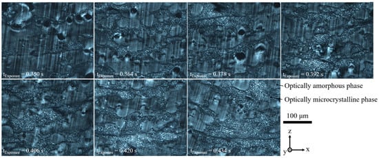 Microstructural characteristics of manufactured specimens are significantly influenced by the underlying exposure time and corresponding varying thermal processing properties. Shown in Figure 9, a correlation between the extent of the optically visible, micro-spherulitic phase and the corresponding exposure time suggests an impact on process-dependent crystallization kinetics on the microstructure of emerging parts. Considering the process-dependent crystallization kinetics, elevated crystallization temperatures represent a prerequisite for the formation of micro-spherulitic phases in contrast to the formation of optically amorphous phases, formed at lower crystallization temperatures. However, observed heterogeneous part morphologies indicate a complex interdependence of applied processing parameters and resulting part morphologies.