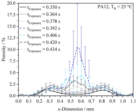 In addition to the process-dependent formation of distinct crystalline superstructures, process-dependent temperature fields are correlated with the formation of characteristic patterns of the distribution of pores, determined by means of computed tomography, displayed in Figure 10. The formation of pores depicts a considerable influence of the underlying exposure time, indicating a correlation of increased segment-specific exposure times and the formation of pores in the center of the exposed cross section. In contrast, when applying reduced energy density levels, a bimodal spatial porosity distribution can be observed, indicating the occurrence of merely low levels of porosity on the edge area. The underlying segment-specific exposure time depicts a non-linear correlation with the corresponding part porosity, exhibiting a sudden increased towards a considerable extent of central pores when exceeding an exposure time of 0.392 s, depicting a pronounced trimodal distribution. A further increase of the exposure time is associated with the less pronounced concentration of pores in the part center, depicting a reduction of centralized porosity, suggesting an influence of thermal degradation and improved material coalescence as opposite effects on central part porosity. The influence of improved material coalescence is assumed to be associated with increased peak temperatures, corresponding to a reduced melt viscosity as well as an increased timespan available for material coalescence. Furthermore, regardless of varying porosity levels in the center of manufactured parts, a positive correlation of the applied energy density and the occurrence of porosity near the edge region can be observed, associated with increased peak temperatures.