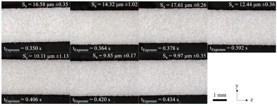 To determine the influence of varied processing parameters on morphological and mechanical characteristics, the underlying quasi-simultaneous, segment-specific exposure time was varied in discrete steps, displayed in Table 1.