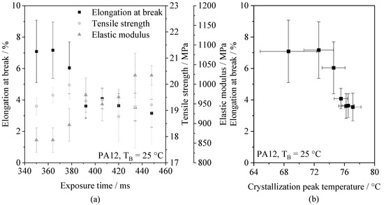 In addition to observed microstructural variations, associated with specific thermal processing properties and varying crystallization kinetics, influences on emerging mechanical part properties can be derived. Observed mechanical properties depict a structural influence of the applied exposure time on the failure behavior of manufactured specimens, displayed in Figure 13, leading to an enhanced elongation at break while minimizing the required exposure time. A significantly reduced tensile strength is observed when utilizing thin-walled geometries with a cross section of A = 2.5 mm2 and the applied build orientation, regardless of the processing parameters used. These observations are in accordance with findings by Sindinger et al. [39,40] regarding quasi-isothermal LPBF, describing significant reductions of both the tensile strength and the elongation at break of thin-walled specimens of tensile specimens built perpendicular to the powder bed plane, associated with significantly impaired failure properties. Furthermore, the interdependence of morphological and corresponding mechanical properties indicates the correlation of the extent of the optically amorphous phase and the elongation at break. An increased variance of the elongation at break observed for reduced exposure times is assumed to partially rely on the statistical occurrence of defects, such as insufficient inter-layer bonding, and is associated with the build orientation of manufactured tensile specimens. However, the elongation at break does not depict a correlation with the respective surface roughness of manufactured specimens, indicating an effect of microstructural properties on the observed mechanical variations, in accordance with corresponding observed morphological alterations regarding the occurrence of centralized porosity and nano-spherulitic microstructures.
