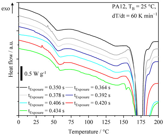 The occurrence of elevated cooling rates, observed in situ using thermographic imaging, is correlated with the emergence of thermally induced post crystallization of metastable phase compositions [22,23,41]. By applying non-isothermal differential scanning calorimetry, the occurrence of cold crystallization can be identified. Figure 14 illustrates merely negligible effects of varying processing conditions on the degree of cold crystallization with respect to the previously discussed process-dependent morphological variability.