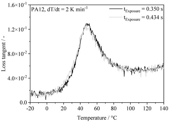 In contrast to the aforementioned morphologically represented dual-phase composition of micro-spherulitic and optically amorphous phases, observed thermal properties of manufactured specimens do not corroborate the formation of a dual-phase morphology. Instead, thermal investigations indicate the formation of nanoscopic crystalline structures, not detectable by means of light microscopy in the visual spectrum. In accordance with findings by Fischer et al. (2017) [42], the formation of nano-crystalline structures is correlated with adapted mechanical failure properties, describing both a reduced tensile strength and an increased elongation at break at reduced crystallization temperatures, consistent with observed mechanical properties. Based on complementary dynamic-mechanical characterizations, no significant influences of varied exposure times on temperature-dependent dynamic mechanical properties are derived, as seen in Figure 15.