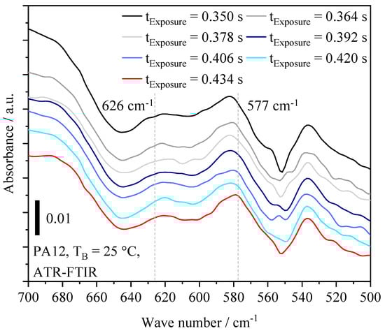 Displayed in Figure 16, ATR-FTIR measurements of manufactured specimens depict distinct peaks at 577 cm−1 and 626 cm−1, corresponding to the Amide VI band, and are associated with the formation of the α-phase and the γ-phase, respectively [44,45,46]. Despite structural similarities of determined FTIR spectra, qualitative differences of the absorption peaks indicate the facilitated formation of absorption peaks attributed to the α-phase. These differences, induced by reduced exposure times, are correlated with an increased extent of supercooling. Furthermore, a shift towards an increased frequency, observed for the 577 cm−1 peak, is correlated with reduced crystallization peak temperatures. In addition to explaining thermal material properties, the identified phase composition is correlated with a reduced Young’s modulus and a reduced tensile strength of fabricated tensile specimens [46]. Although thermographic observations suggest the intermediate formation of mesomorphic fractions given the observed crystallization temperatures [22,47], the thermal history of distinct layers suggests the occurrence of cold crystallization of metastable fractions induced by repeated heating due to the exposure of subsequent layers. Consequently, given the thin-walled part cross section, experimental findings indicate a superposition of geometric influences [39] and the present polymorphism of polyamide 12 on emerging mechanical properties.