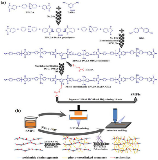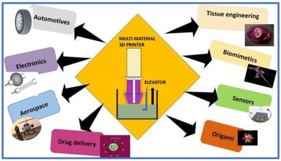 The evolution of additive manufacturing technologies has enabled the industry to develop complex-shape polymer-based parts for novel applications at lower costs [33,34,35,36]. Developed liquid resins are often used to fabricate smart components via a range of rapid prototyping methods based on photopolymerisation, material extrusion or material jetting techniques [35,36,37,38,39].