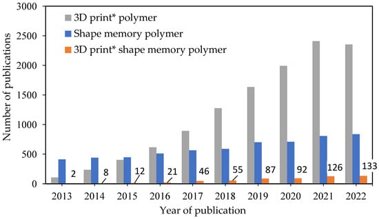 In recent years, shape memory polymers and their composites (SMPs/SMPCs) have attracted substantial attention due to ease of processing, lightweight properties and low cost compared to their metallic counterparts, namely shape memory alloys. SMPs are materials that can recover from temporarily induced deformations to their original shape. Most SMPs are chemically crosslinked (thermosets) or physically crosslinked (thermoplastics). The two stages of the shape memory effect (SME) for the SMPs are shape fixing (temporary shape) and shape recovery (permanent shape). Many conventional fabrication methods have been used to develop shape memory polymers. However, the need for complex geometric designs exhibiting shape memory behaviour has compelled researchers to ponder the compatibility of these materials with 3D printing fabrication methods, which offer leading production technology to achieve such designs. In accordance with the recent additive manufacturing (AM) standard ISO/ASTM 52900:2021 [1], there are different categories of AM technologies that can be used to fabricate shape memory components in order to employ them in various innovative applications (Figure 1). Therefore, 3D printing (3DP) publications of shape memory polymers have rapidly increased in the last ten years (Figure 2). The shape memory polymer market size was USD 450 million in 2021, and it is forecast to grow by 2030 to become around USD 3.5 billion, driven by the growing product demand in the automotive, aerospace, etc., sectors using various polymeric materials, such as polyurethane, poly(vinyl chloride), acrylic and epoxy [2].