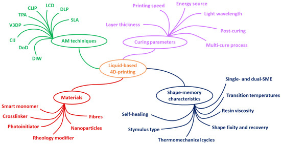 The organisation of this review paper is as follows: First, a general introduction on liquid-based 4DP and its technologies with an emphasis on SMPs is provided, followed by a detailed explanation on the working of liquid-based 3DP techniques. Then, the mechanisms of 4DP and SMP are described. Furthermore, materials for photopolymerisation, jetting and DIW extrusion techniques are comprehensively represented based on a literature review of the current work, which focuses on the effect of the inclusion of photoinitiator, nanoparticle and micro/nanofibre on the polymerisation process, shape memory properties and mechanical characteristics of the 3D-printed components. Finally, the conclusion and future scope in this review outline the challenges facing liquid-based 4DP technologies and their key solutions.