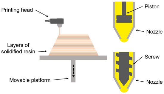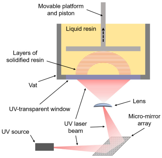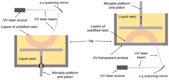 The SLA technique builds a 3D part by focusing a UV laser on the photopolymerisable resin to link the molecule chains [40,45]. The apparatus consists of a vat containing liquid resin and a movable build platform (Figure 4). The conventional apparatus layout has a UV source, an x-y scanning mirror over the resin and a platform that moves downwards as the UV laser beam locally cures the resin, i.e., photopolymerises the resin layer by layer. The inverted layout has a UV-transparent window on the bottom of the vat, and the UV source and the x-y scanning mirror are placed under the vat, the build platform moving upwards as the resin is locally UV cured layer by layer [41,45,46]. The time required to print each layer relies on the UV laser beam speed and the irradiated area. These, in turn, are a consequence of a set of scanning mirrors, which reflect the laser beam along the x-y plane, photocuring the resin pixel by pixel, so that the surface of the photoreactive resin is sequentially exposed to the scanning laser beam [41,46]. When completing printing, the object is pulled out from the remaining resin in the vat. It is cleaned with a cleaning agent, e.g., isopropanol, to remove any unreacted resin and then is subjected to a UV post-curing stage to improve the part’s final properties [40].