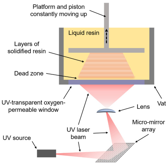 CLIP arises as a development from the DLP system, having the same irradiation technology, but allowing the part to be built uninterruptedly with a continuous liquid surface, i.e., the build platform is constantly moving rather than stepwise, as in conventional vat photopolymerisation techniques (Figure 6). This behaviour leads to avoiding layer separation and recoating so that the printing process is claimed to be even faster, as there is no need to pause it between each printed layer [41,67,68,69]. The main advantage of CLIP is the polymerisation inhibition due to the oxygen content in the dead zone, causing the partially consumed reagents at the bottom region of the solid to behave like a living polymerisation system as the liquid interface is continuous [70,71].