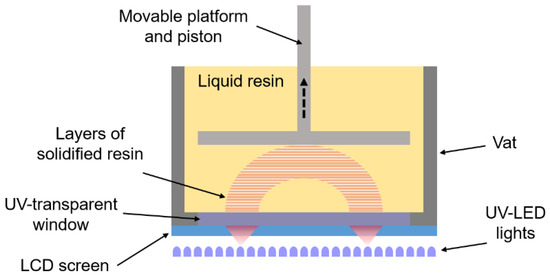 Further development from DLP has led to LCD-based stereolithography. In this method, the micro-mirror and lens set is replaced with an LCD screen powered by UV-emitting LEDs. These, like DLP, can irradiate or suppress each pixel; therefore, as the LEDs project the part’s cross-section, the liquid crystal screen launches this projection through the UV-transparent window to the resin in the vat [75]. The LCD-SLA also allows the whole layer to be exposed at a single step and to cure simultaneously, building the part layer by layer (Figure 7). Employing LCD-SLA for shape memory 4D-printed polymeric resins has effectively proved the ability of this technique to print high-quality 4DP components [76,77].