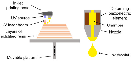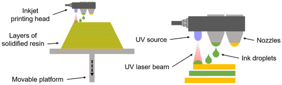 In contrast to vat photopolymerisation 3D printers, material jetting technologies enable one to print different polymer materials in a single process, offering, for instance, the possibility to change colours, formulations or fabricate parts that have specific features localised at different positions [78,79]. In the case of photopolymers, material jetting relies on depositing droplets of liquid photoreactive resin on an x-y plane, which are immediately irradiated by a UV laser to initiate polymerisation at that spot and prevent material waste, by-products and debris [80,81,82,83]. These technologies evolved from single-layer 2D-printing techniques; hence, the three-dimensional part is built as ink deposited layer by layer [81,82,84]. The MJ printer jets at least two materials, i.e., build material and support material [85]. After printing, the jetted materials will be immersed in a solution to dissolve the support material. Some technologies, such as Stratasys’ polyjet or 3D Systems’ multijet printing, use an additional layer-levelling process before curing [86,87,88]. It should be noted that polyjet and multijet printing are trademarks representing MJ technology. The two common sorts of 3DP liquid-based jetting materials are CIJ 3D printing and DoD 3D printing.
