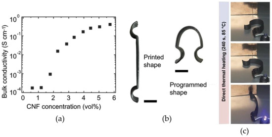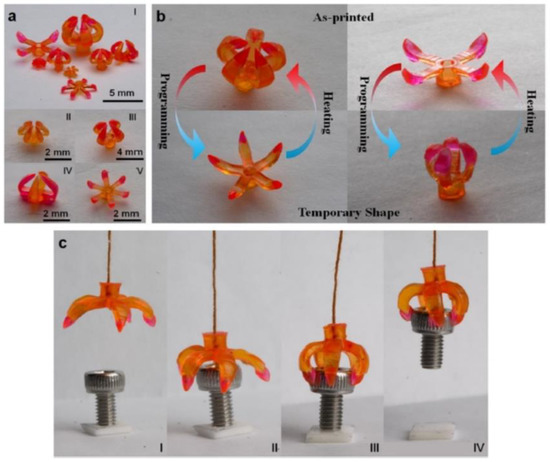 In essence, 4D printing (4DP) is a process by which 3D-printed components can be programmed to transform their shape over time when exposed to external stimuli. The 3D-printed component has only one static structure. In comparison, the 4D-printed smart component has at least two smart states, i.e., static and dynamic structures. The smart dynamic structure is activated by an external stimulus, triggering the shape and morphological transformations that can be effectively controlled and linked to macroscopic movements [3,4]. The smart component recovers its original shape in response to a specific stimulus depending on the requirements of end use, such as physical stimuli (thermosensitive [5], light-responsive [6], electrical/magnetic-responsive [7], etc.), chemical stimuli (moisture-responsive [8] and pH-responsive [9]) and biological stimuli (biomolecule-responsive) [10].