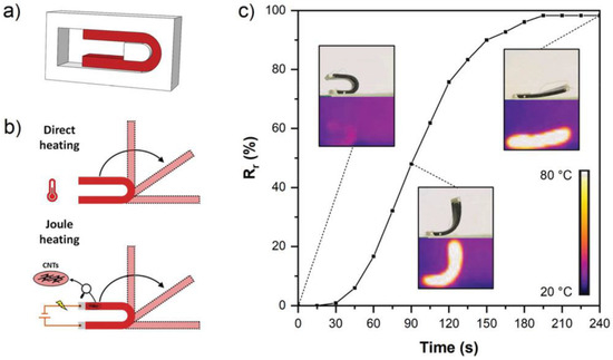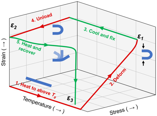 There are two procedures for SMPs, temporary shape and permanent shape recovery. In the temporary shape process, physically, the entropy increases when the polymer is heated, which decreases the difference between entropy and an internal energy that leads to increased movement in polymer chain orientations and, thus, increases the polymer deformability. Consequently, the polymer can deform into a desired temporary shape upon applying an external force. The temporary shape can be fixed for a long time (shape fixity, Rf) by cooling and then removing the external force. Furthermore, the temporary shape can be controlled to maintain the desired shape, depending on the designed strain ( and the external force. This temporary shape with a strain of ( can be gradually reformed to the original permanent shape with a strain of ( without external force during reheating (shape recovery, Rr) (Figure 12). The shape fixity and shape recovery can be calculated from the equation below: